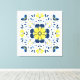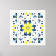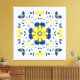 A radiant mandala-style floral design featuring symmetrical yellow and navy-blue blossoms with soft blue accents
