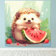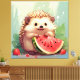 charmante illustration d'un hérisson jouissant d'un morceau de pastèque. Le hérisson a une expression joyeuse, les yeux fermés dans la joie, et est entouré de fraises et de feuilles. Le style croquis à l'encre ajoute une touche fantaisiste et mignonne à la scène.