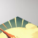 With its flattened perspective, simplified forms, and vibrant palette of burnt oranges, muted golds, and cool blues, the artwork channels the optimism of Art Deco and the grandeur of WPA-era futurism. Stylized clouds drift past, grounding the idealism in a dreamlike realism.