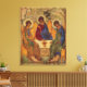 Trinity Angels À Mamre belle peinture chrétienne médiévale par andre rublev de son interprétation de la trinité avec trois anges avec ailes dorées, halo, vert, bleu et doré cloaks, assis ensemble autour d'une table avec un bol d'or. temps médiéval illustratif fine art peinture dans le blues, les or, et les verts, dans un délicat et raffiné peinture religieuse de belles couleurs dorées dans un design stylisé et élégant. Des couleurs aux lignes élégantes et aux couleurs dorées et fraîches, aux effets froids mais colorés et éclatants.