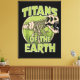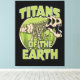 "Titans of the Earth" T-REX - Tyrannosaurus Rex - Logo de dessin humoristique Fossil du célèbre dinosaure contre un arrière - plan orange vif.