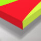 Mi-Siècle Moderne Trois Poissons Poisson Art Toile Enveloppé. Trois poissons bleus turquoises de différentes tailles avec des bulles contre un arrière - plan rouge avec des nuances d'ovales vert citron. Un complément parfait à votre style du milieu du siècle signé par l'artiste Gail Gabel, infirmière à la retraite.