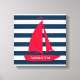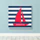 Impression de toile rayée bleu marine et blanc, conçue avec un bateau rouge et personnalisée avec votre nom. Un complément parfait à votre décor de maison de plage.