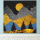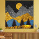 Paysage montagnard Abstrait dans des tons audacieux d'or, noir et bleu avec un lever de lune et des oiseaux.