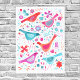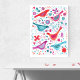 Joli tableau aquarelle dans un style moderne d'oiseaux colorés et lumineux dans un jardin de fleurs aux tons rose, violet, orange et bleu turquoise. Parfait pour les ornithologues, les amoureux de la nature et les jardiniers.