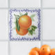 Ce charmant carrelage en céramique de style européen présente deux oranges somptueuses entourées d'une bordure de toile ! Une bande d'oranges mûres et lumineuses sur une branche encerclée de généreux feuilles verts. Une bordure de toile bleu marine royale filagreement borde le design. Une touche parfaite pour votre cuisine inspirée de la campagne italienne ou française ! Es-tu prêt à faire du jus d'orange ?