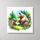 Un ours maman joue avec son bébé ourson dehors dans un champ d'herbe et de fleurs avec un arrière - plan de pin. Aquarelle style art.
