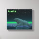 Un moment de paix dans la longue nuit arctique. Un Ours Polaire repose au bord d'une zone ouverte dans la glace de la meule.Les aurores nordiques brillent au loin; les étoiles brillantes scintillent au-dessus. Le texte "Alaska" apparaît en vert et blanc brillant. Les ours polaires sont en danger. Combien de temps encore des scènes comme celle-ci pourront-elles se produire ? S'il vous plaît aidez à sauver les ours polaires de l'extinction.