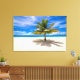 Cette photo montre un palmier debout sur une plage de sable blanc.
