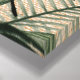 Un élégant palmier accueille deux Budgerigars colorés sur un arrière - plan de style héessien donnant à la toile une atmosphère tropicale et rustique.