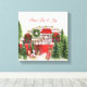 Impression en toile avec un thème de Noël mignon et fantaisiste. Une caravane cosy décorée pour Noël entre quelques pins. Paix, Amour & Joie écrit en haut.