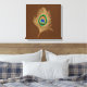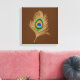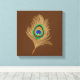 Toile enveloppée dans un dessin vectoriel d'une plume de paon, rehaussée et rendue dans un effet d'écrémage de côte doux - beige doré doux et plumes tan, avec rouille, bleu cobalt, et oeil vert émeraude, sur un arrière - plan chocolat