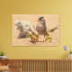 L'image est ornée d'un moineau à couronne blanche, posé sur un sol sablonneux près de quelques petits plantes. L'oiseau a une tête rayée noire et blanche, un bec jaune, et un plumage brun et gris. L'arrière - plan est une étendue de sable floue, suggérant une plage ou un environnement désertique. Le moineau apparaît en alerte et est capturé dans un cadre naturel extérieur.
