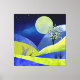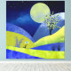Un paysage abstrait représentant des collines ondulées avec un arbre printanier fleuri et des plantes et une lune et des étoiles dans les tons bleu, cyan, jaune et rose.