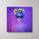 A woman with a sunflower crown and dark sunglasses stands in a purple haze.