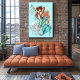 Sirène aux cheveux rouges portant des bijoux en or. La sirène a une queue turquoise, bleue et verte. Autour de la sirène se trouve un hippocampe, des méduses, des coquillages et des bulles d'eau, le tout en toile de fond bleu