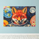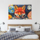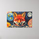 Cette œuvre d'art vibrante d'Otis Porritt présente un renard saisissant, rendu avec des coups de pinceau riches et texturés, regardant avec confiance depuis l'intérieur d'un casque d'astronaute. La fourrure orange et blanche du renard contraste avec le bleu profond de sa visière et le rouge audacieux de son scaphandre, complété par un patch de drapeau américain. Derrière l'explorateur intrépide, un cosmos tourbillonnant éclate de bleus, de violets et d'orangés vifs, parsemé de corps célestes, dont une lune proéminente. Le style dynamique et pictural donne au médium numérique une qualité tactile, donnant vie à la scène cosmique.