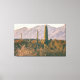 L'image présente un paysage désertique avec plusieurs cactus de saguaro au premier plan. Les cactus sont grands et verts, se détachant de la végétation sèche, brun doré. Dans l'arrière - plan, une série de montagnes est visible, leurs sommets légèrement poussiérés de neige.