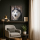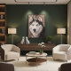 Cette peinture numérique représente un Husky sibérien debout sur la neige, sa fourrure brillant de reflets glacés tandis que le paysage hivernal s'étend sans fin derrière lui. Les yeux expressifs du chien attirent l’attention du spectateur.