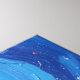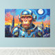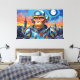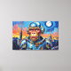 Cette œuvre d'art vibrante présente un gros plan captivant du visage d'un chien, encadré dans la visière claire du casque d'un astronaute. Rendu avec des traits audacieux et texturés dans une palette dynamique d'orangés, de bleus et de rouges, le regard expressif du canidé rencontre le spectateur. L'arrière-plan se déploie en une étendue cosmique stylisée, présentant des planètes lointaines et des formations éparpillées rappelant des nébuleuses, le tout rendu avec un effet tactile, presque impasto. Le détail complexe de la fourrure et du casque contraste avec les éléments énergiques et abstraits de l'espace environnant, créant une narration visuelle saisissante.
