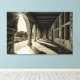 Une photographie sépia capture une longue allée voûtée construite en pierre sur le campus de l'Université de Stanford. La promenade est bordée de piliers et d'arcs d'un côté, et d'un mur en pierre avec des ouvertures en forme de fenêtre de l'autre. La lumière du soleil traverse les arches, créant de fortes ombres sur le sol carrelé. Dans l'arrière - plan, un jardin arboré et couvert de haies manucurées est visible.