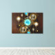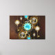 Turquoise lenses with antique watch with brass gears and golden keys on rusty, brown background. Steampunk style.