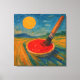 Cette peinture numérique surréaliste et vivante présente un pinceau géant planté au sommet d'une pastèque rouge divisée en deux, mêlant nature et créativité dans une composition ludique et onirique. Un grand soleil jaune s'embrase dans un ciel texturé et bleu, réchauffant un vaste paysage minimaliste peint de vert, de bleu et de jaune. La scène mêle fantaisie et profondeur symbolique, suggérant un monde où la création et la réalité sont inséparablement liées.