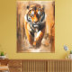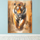 Une représentation électrisante d'un tigre au milieu du trottoir, peinte avec des touches audacieuses et expressives qui mêlent réalisme et émotion brute. Le regard du tigre est tourné vers l’avant, intense, inébranlable et vivant avec l’énergie primale. Les tonalités orange et noire vibrantes s’entrelacent dans un arrière-plan de teintes terreuses, créant un contraste dynamique qui amplifie le mouvement et la domination du prédateur. L’arrière - plan abstrait se fond dans la forme de la bête, brouillant la ligne entre la nature et la toile. Il ne s'agit pas seulement d'un tigre : c'est de l'élan, de la concentration et de l'énergie capturés dans la peinture.