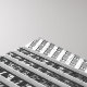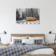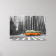 Scène de rue avec tramway vintage en orange vif et vert, dressé contre un paysage urbain en niveaux de gris. Le tramway traverse un carrefour, avec de hauts immeubles qui montent dans l'arrière - plan. Les bâtiments sont en noir et blanc, ce qui crée un contraste saisissant avec le tramway coloré.