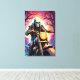 un squelette grippé dans un vélo de pandemonium. Il a un pantalon en cuir noir et des bottes de moto et une veste en cuir noir avec un design osseux sur la tenue de cale.Le soleil couchant derrière lui. La brume qui monte de l'entourage jusqu'à la nuit sombre, il s'éloigne avec des étoiles de nuit au-dessus.