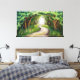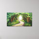 Une image fascinante d'un chemin sinueux à travers une canopée d'arbres verts vibrants. Les branches s'entrelacent au-dessus, créant une arcade naturelle qui mène à une mystérieuse clairière éclairée. Le sentier est bordé par une végétation luxuriante et des touches de fleurs sauvages colorés, ajoutant à l'atmosphère enchanteresse.