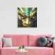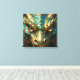 A wall art with a cool close up illustration of a turquoise and metallic gold dragon face with realistic eyes. Fantasy art realism dragon art.