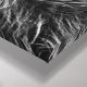 Impression en toile d'une vache écossaise Higland robuste mais drôle avec de grandes cornes, de longs poils devant les yeux et la bouche mi ouverte en noir et blanc / monochrome. Superbe décoration sur votre mur !
