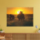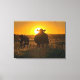 Cette toile d'art brillante montre une vache et un veau debout derrière une clôture en fil de fer barbelé dans les Prairies de l'Alberta avec le soleil couchant derrière la silhouette de la vache.