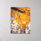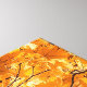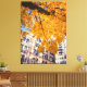 Une image vibrante capture la beauté de l'automne avec une vue rapprochée d'une branche d'arbre chargée de feuilles jaunes dorés. Les feuille, avec leurs veines complexes et leurs formes délicates, créent un contraste saisissant par rapport au ciel bleu clair qui s'égrène. Les branches s'étendent vers une grande bâtisse beige aux grandes fenêtres, faisant allusion au cadre urbain.