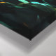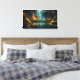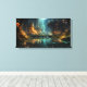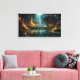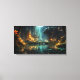 Un temple se trouve au milieu d'une forêt turquoise magique sous la lumière d'une pleine lune. Un pont voisin enjambe une petite rivière qui traverse la scène et de minuscules lumières jaunes scintillent autour de la fleur orange et des feuilles.