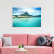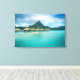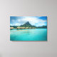 Impression paysagère en toile d'un luxueux complexe de bungalows au toit de chaume surplombant l'eau dans une station balnéaire au bord d'un lagon bleu clair avec vue sur l'île tropicale de Bora Bora, près de Tahiti, en Polynésie française.