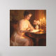 A beautiful young woman in a flowing sheer white gown sits at an ornate wooden desk, writing in a journal. The scene is illuminated by the warm, flickering glow of several candles on a bronze candelabra, creating a serene and intimate atmosphere. Soft pink roses in a vase add a touch of color to the rich, dark interior, evoking a sense of timeless elegance and quiet contemplation.