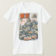 Retro-inspired T-shirt design featuring a powerful vintage robot towering over Tokyo, with bold Japanese characters and explosive energy. A striking mix of Japanese pop culture, sci-fi, and classic poster style.