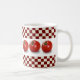 Eine niedliche Tasse perfekt für trinkende Suppe an einem kalten Tag! Er kennzeichnet die roten und weißen Karos auf der Spitze und der Unterseite. In der Mitte ist Bilder von sechs Tomaten und von Titel Tomate-Suppe.