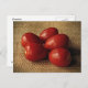 Diese köstliche Postkarte zeigt ein Stillleben Foto von 5 reifen, saftigen, roten Tomaten, die mit großem Geschmack bersten. Sie sind auf einer goldbraunen Strohmatte eingerichtet.