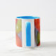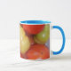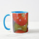 Eine weiße Tasse mit blauem Rand und Griff, mit einem Foto reifer Tomaten