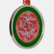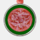 Foto der roten Tomatenscheibe auf grünem Hintergrund. Ein ungewöhnliches Ornament, das für Tomatenzüchter, Koch oder Menschen, die Tomaten mögen, ideal ist.