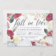 D'élégantes invitations rustiques pour les douches nuptiales d'automne ou d'automne sont entourées de fleurs d'aquarelle bordeaux, de plumes de saumons et de citrouilles blancs. "Fall in love" apparaît en haut dans le script de calligraphie chic en lettres. Personnalisez avec votre douche nuptiale et les détails du registre sous le riche lettrage bleu marine.