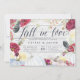Les élégantes invitations rustiques pour les fêtes d'automne ou d'automne présentent une bordure de fleurs d'aquarelle bordeaux, de plumes de bouho et de citrouilles blancs sur un arrière - plan blanc en bois de shiplap. "Fall in love" apparaît en haut dans le script de calligraphie chic en lettres. Personnalisez avec vos détails de célébration fiançailles sous la riche lettres bleu marine.