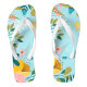 Une paire de tongs colorés ornés de motifs floraux sur un arrière - plan bleu vif.