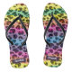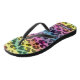Des tongs tendance féminine avec un motif design léopard aux couleurs arc-en-ciel ; personnalisable en ajoutant votre nom en lettres blanches sur un étiquette violet foncé