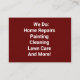 Auf der Vorderseite dieser Visitenkarte befinden sich Bilder einer Gruppe von Tools. Auf der Rückseite der Karte finden Sie Text für das, was Ihr Unternehmen Kunden anbietet. Die Karte kann für Bauer, Zuhause-Reparatur, Handwerker, Generalunternehmer und mehr verwendet werden! Passen Sie Ihre individuellen Schriftart-Stilrichtungen, -größen und -farben, Textzeilen und Papiersorten an, die Ihren Bedürfnissen entsprechen. Kauf in einer Packung von hundert oder rett mit Schüttgutbestellungen.
