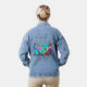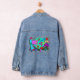 Eine lustige Cartoon-Stil Retro nostalgischen Spaß Multi-Farbe verrückte Neon 90er Jahre vibe elektrifizierend epischen Retro-Stil abstrakt fluoreszierende Taschenback Vintag ästhetische klassische Retro-Denim Jean-Jacke werfen eine coole epische phantastischen 90er Jahre enim jean Jacke heute.