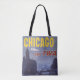 Affiche de voyage d'époque pour les vols de Trans World Airlines à destination de Chicago montrant des ponts enjambant une rivière la nuit, vers 1960.